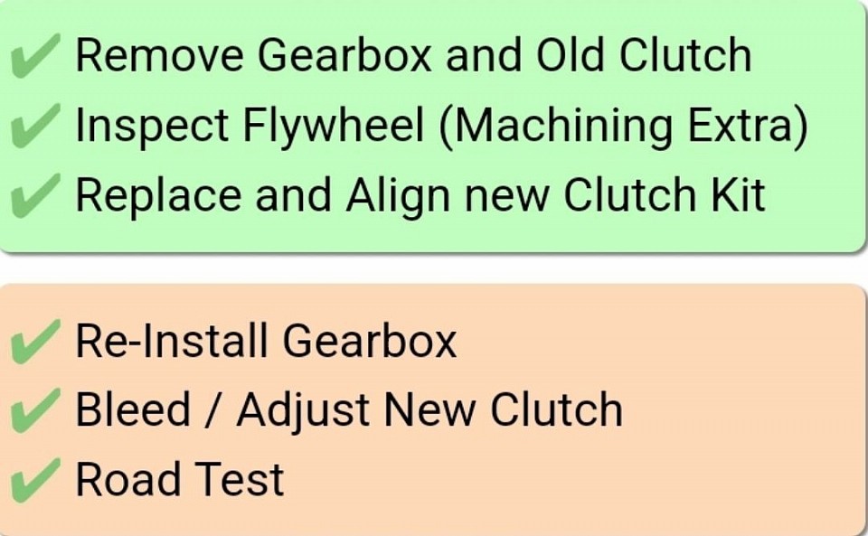 Utilizamos únicamente piezas y fluidos de alta calidad, respaldados por nuestra garantía de 12 meses. Normalmente, un kit de embrague consta del plato de presión, el disco de embrague y el cojinete de desembrague. Si bien realizamos la mayoría de las reparaciones in situ, nuestra máxima prioridad es la seguridad en el lugar de trabajo. Si nuestro técnico determina que el lugar de trabajo no es adecuado, podríamos recomendarle que reubique su vehículo.